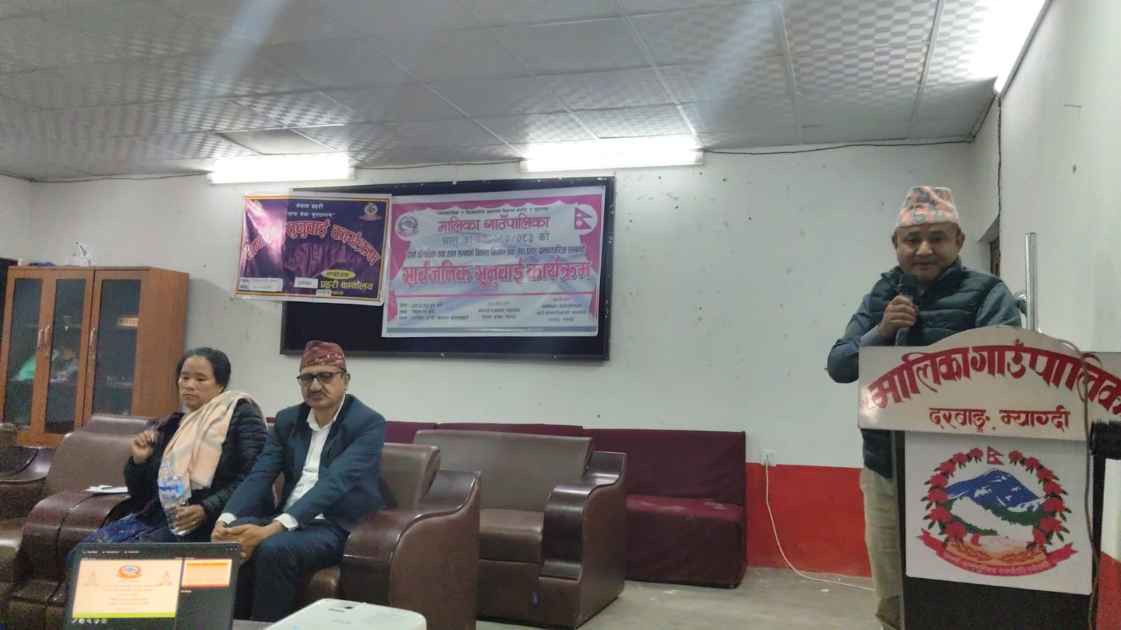 बेनी । म्याग्दीको मालिका गाउँपालिकाको चालु आर्थिक वर्ष २०८२/०८३ को दोस्रो चौमासिक तथा हालसम्मको विकास निर्माण तथा सेवा प्रवाहको प्रभावकारिता सम्बन्धी सार्वजनिक सुनुवाई कार्यक्रम सम्पन्न भएको छ । गाउँपालिकाको केन्द्र वडा नम्बर ६ छ्यारछ्यारे स्थित सभाहलमा गाउँपालिकाको आयोजना र नेपाल पत्रकार महासंघ म्याग्दीको सहजिकरणरसमन्वयमा सार्वननिक सुनुवाइ सम्पन्न भएको हो । गाउँपालिका प...