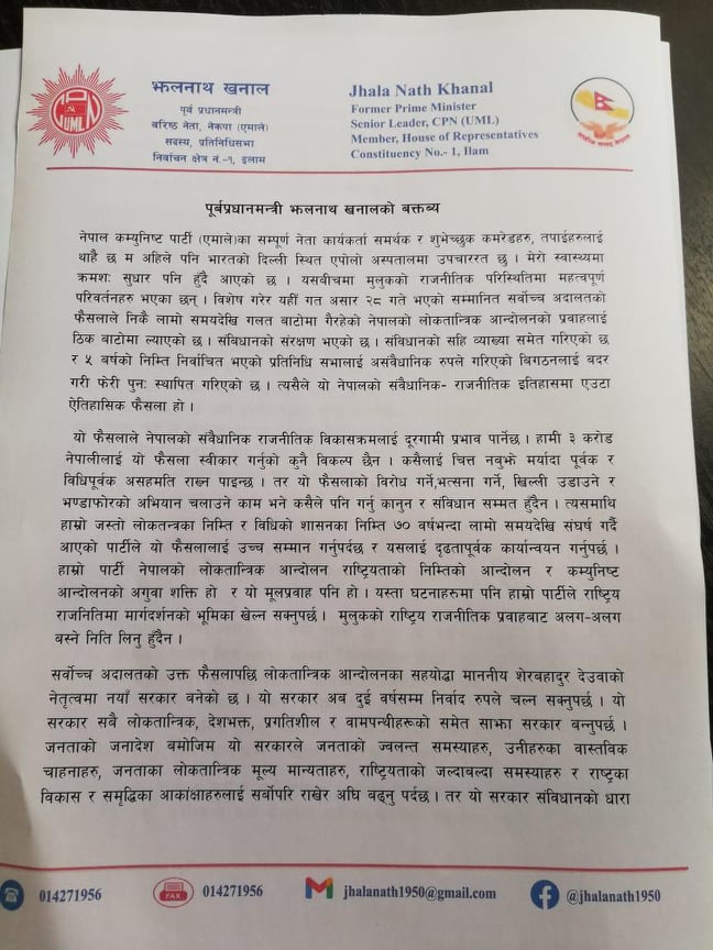 कुनै पनि प्रकारको अलमल र आक्रोसबाट प्रभावित नभइकन देउवा सरकारलाई विश्वासको मत दिन हार्दिक आग्रह गर्दछु,” खनालले वक्तव्यमा भनेका छन्,“मेरो मत पनि विश्वासको मत लिँदा देउवा सरकारकै पक्षमा हुने कुरा पनि यो वक्तव्यमार्फत प्रष्ट पार्न चाहन्छु ।” खनाल हाल भारतको नयाँदिल्लीस्थित एपोलो अस्पतालमा उपचाररत छन् । नागरिक खबरबाट