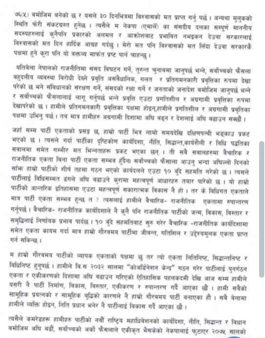आइतबार एक विज्ञप्ति जारी गर्दै पूर्वप्रधानमन्त्री खनालले आफ्नो मत देउवा सरकारकै पक्षमा हुने स्पष्ट पारेका हुन् । “यो सरकार संविधानको धारा ७६(५) बमोजिम बनेको र यसले ३० दिनभित्रमा विश्वासको मत प्राप्त गर्नुपर्छ । अन्यथा मुलुकको स्थिति फेरि संकटग्रस्त हुने छ ।