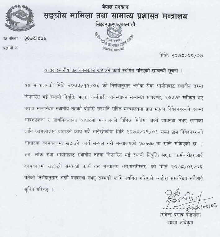 मन्त्रीयस्तर निर्णय गर्दै मन्त्रालयले लोक सेवा आयोगबाट स्थानीय तहमा सिफारिस भई स्थायी नियुक्ति भएका कर्मचारीलाई कामकाजमा खटाउने कार्य हालका लागि स्थगित गरेको हो । पुस ६ मा मन्त्रीस्तरीय निर्णय गर्दै मन्त्रालयले अर्को व्यवस्था नभएसम्मका लागि कामकाजमा खटाउने कार्य स्थगित गरिएको जनाएको छ। नागरिक खबरबाट