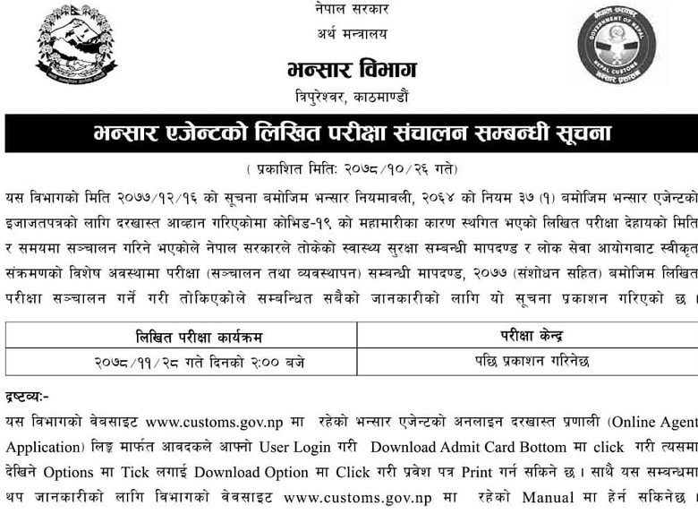 विभागले भन्सार नियमावली, २०६४ को नियम ३७ (१) बमोजिम भन्सार एजेन्टको इजाजतपत्रका लागि दरखास्त आह्वान गरेको थियो । तर, महामारीका कारण लिखित परीक्षा पटक–पटक स्थगित हुँदै आएको थियो । तोकिएको नयाँ मितिअनुसार एजेन्टको परीक्षा फागुन २८ गते दिउँसो २ बजे हुनेछ । यसका लागि विभागले लोकसेवा आयोगसँग परीक्षा केन्द्र खोजिदिन आग्रह समेत गरिसकेको प्रवक्ता पुण्यविक्रम खड्काले जानकारी दिनुभयो । रातोपाटीबाट
