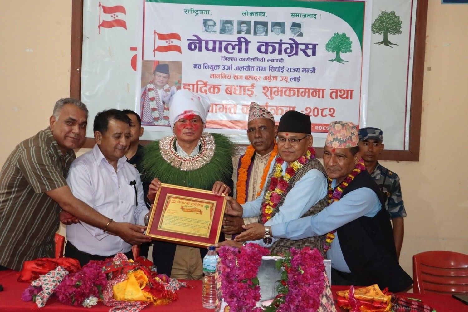 कार्यक्रममा संविधानसभा सदस्य रेशमबहादुर बानियाँ , उपसभापतिद्धय हरिकुमार श्रेष्ठ र केवी भण्डारीले बधाई सहित सफल कार्यकालको शुभकामना व्यक्त गर्नुभएको थियो ।बेनी नगरपालिका परिसरदेखि संगमचोक स्थित पार्टी कार्यालय सम्म नेता तथाकार्यकर्ता ,शुभेच्छुक लगायतले बाजागाजा ,¥याली सहित भव्य स्वागत गरेका थिए । पार्टी कार्यालयमा नेपाली कांग्रेस म्याग्दीको तर्फबाट बधाई सहितको सम्मानपत्र समेत प्रदान गरिएको थियो । पार्टी जिल्ला सचिव हिराबहादुर पुनले कार्यक्रम संचालन गर्नुभएको थियो ।