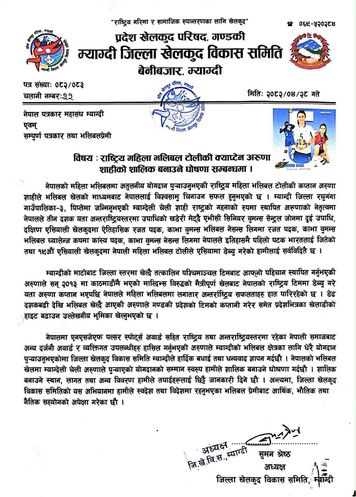 जिल्लाको रघुगंगा गाउँपालिका–३, पिप्लेमा जन्मेकी शाहीले भलिबलमार्फत नेपाललाई अन्तर्राष्ट्रिय स्तरमा चिनाउन ठूलो योगदान पुर्याउनुभएको छ। त्यही योगदानको कदर गर्दै शालिक बनाइने घोषणा गरिएको हो ।