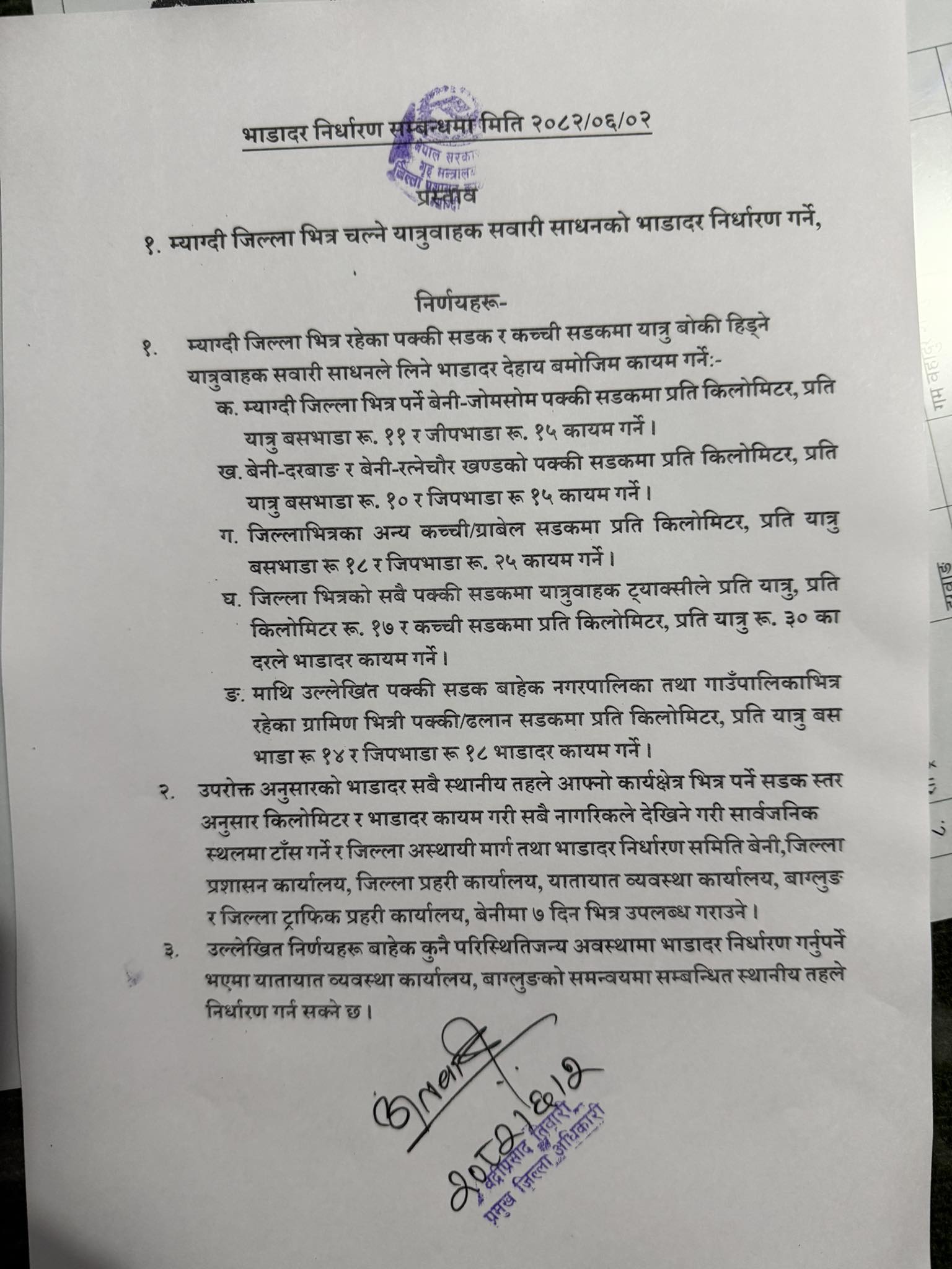 समितिले म्याग्दी खण्डमा पर्ने बेनी–जोमसोम सडकखण्डमा प्रति किलोमिटर प्रति यात्रु बसभाडा १० रुपैयाँ, जीप भाडा १५ रुपैयाँ, बेनी–दरबाङ र बेनी–रत्नेचौर सडकखण्डमा बसमा प्रतिकिलोमिटर १० रुपैयाँ र जीपमा प्रति किलोमिटर १५ रुपैयाँ भाडा तोकिएको छ ।