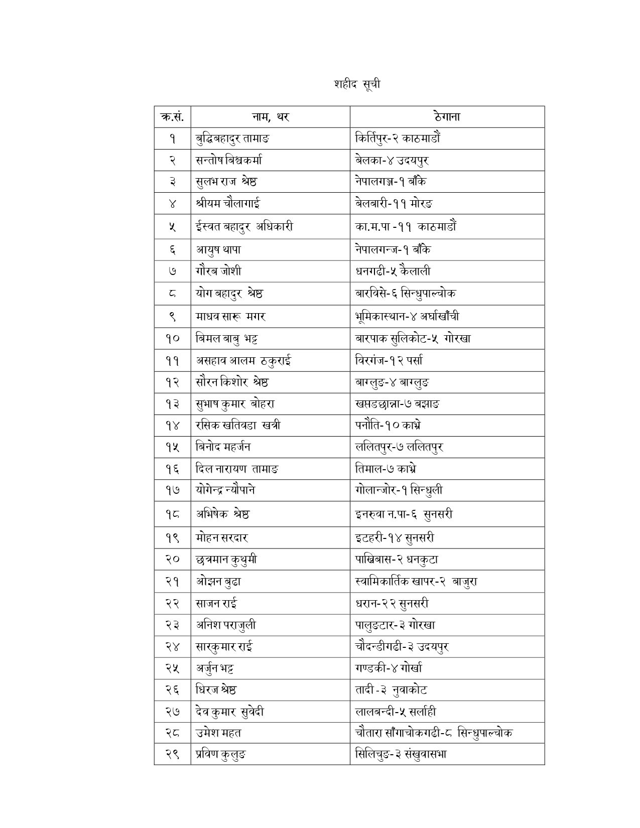 गृह मन्त्रालयले सोमबार नै सहिदहरूको सूची सार्वजनिक गरेको छ । जेनजी आन्दोलनका क्रममा कुल ७६ जनाको मृत्यु भएको थियो । जसमा ४५ जनालाई मात्रै सरकारले सहिद घोषणा गरेको हो।