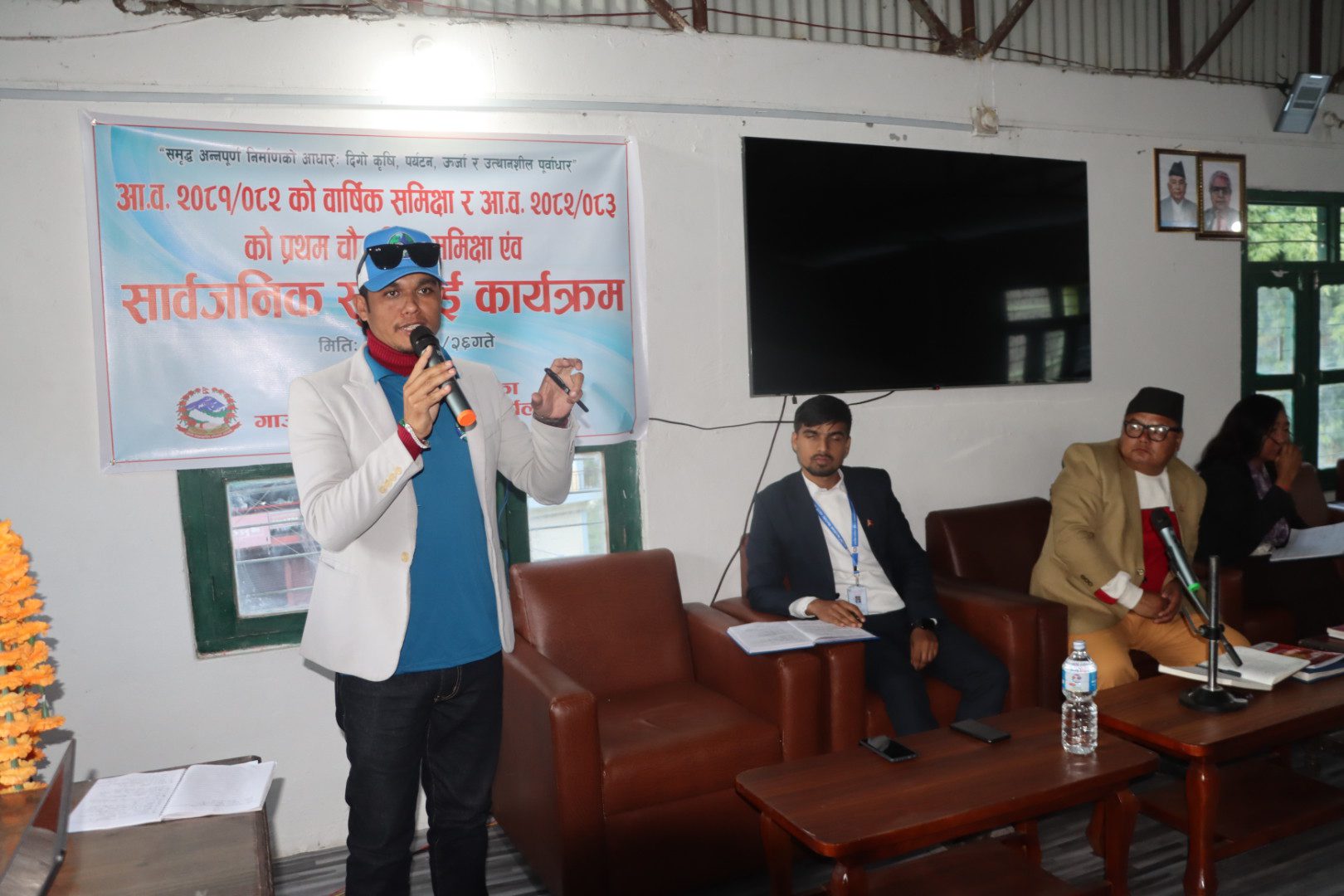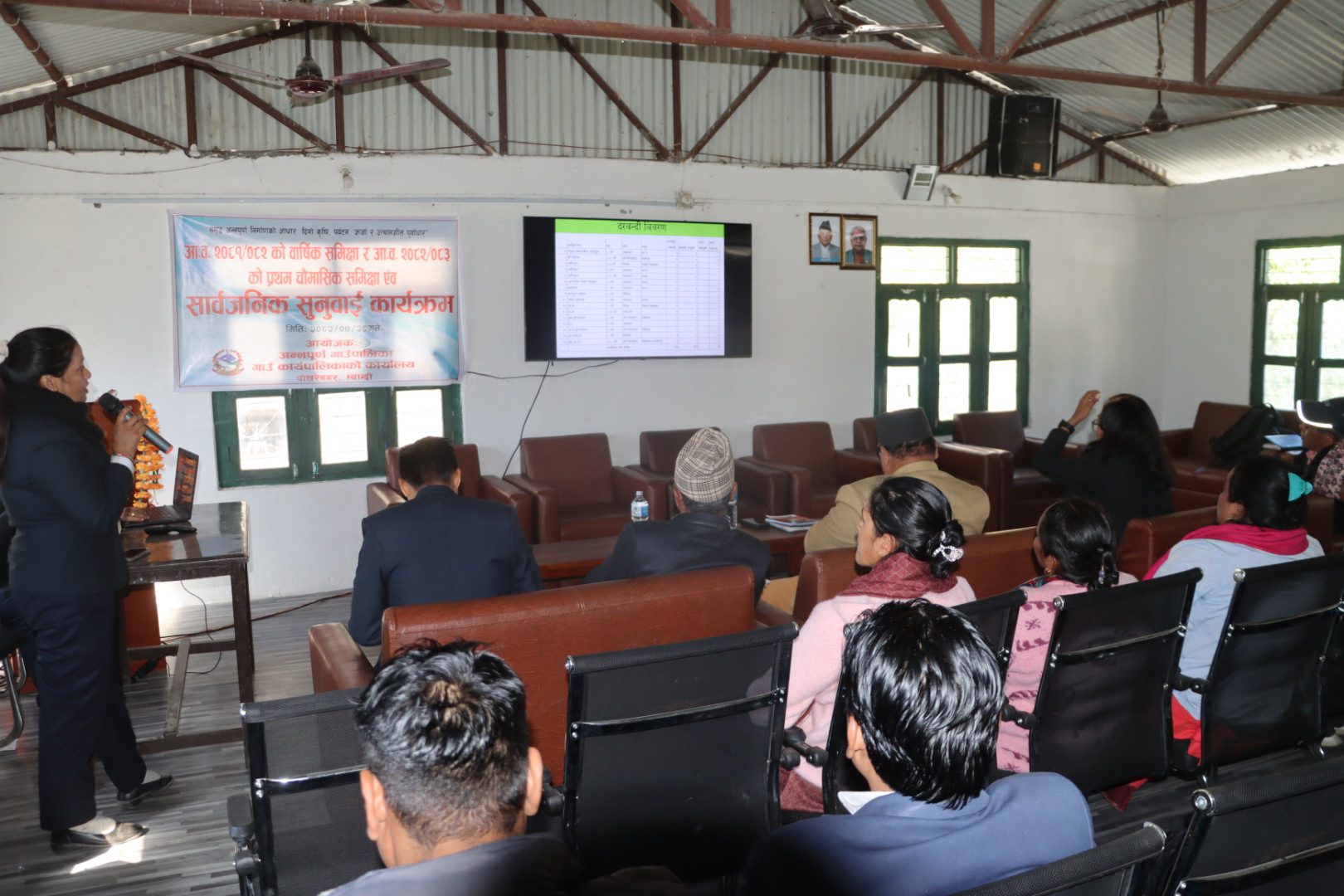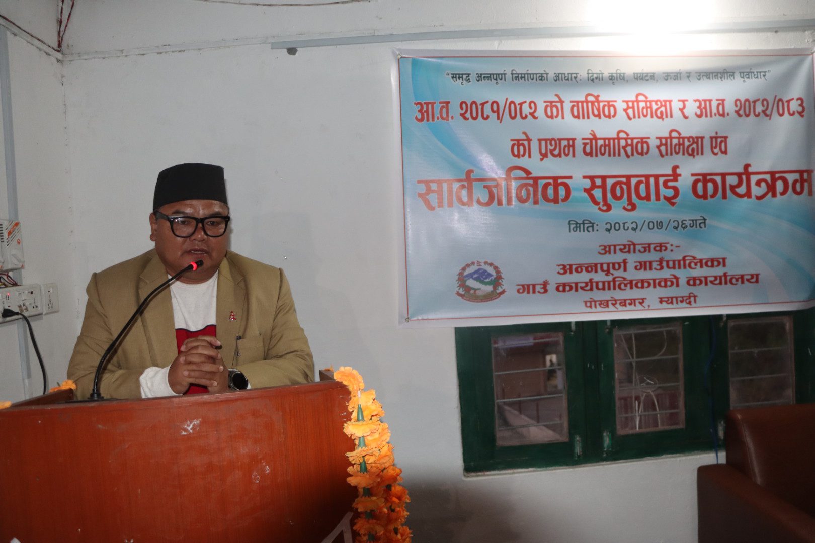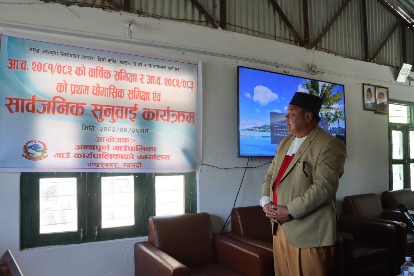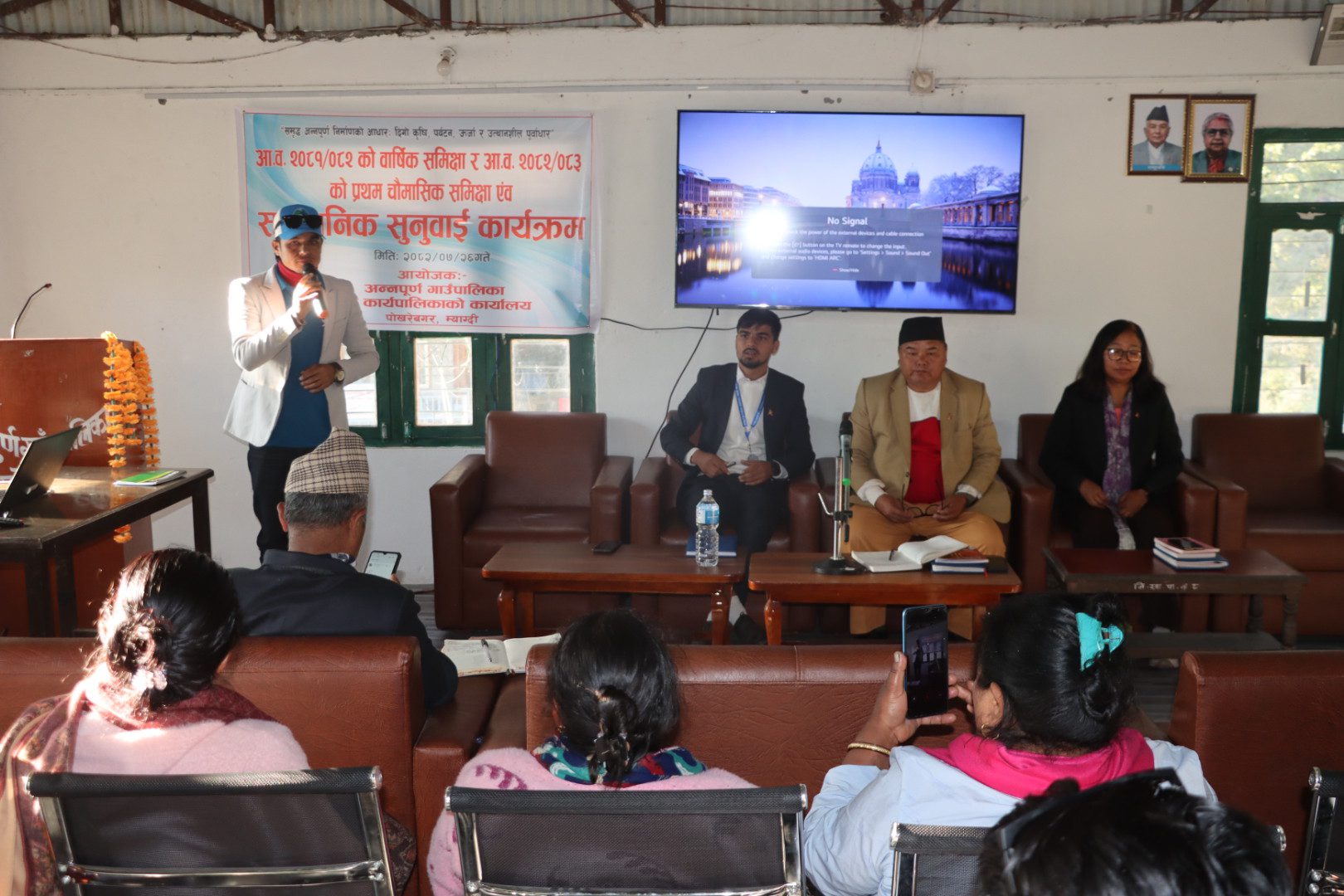 ‘समृद्ध अन्नपूर्ण निर्माणको आधार ः दीगो कृषि, पर्यटन, ऊर्जा र उत्थानशील पूर्वाधार’ भन्ने मूल नारासहित गतवर्ष र चालु आवको चौमासिक अवधिसम्म सञ्चालित कार्यक्रम, सम्पन्न योजनाहरु र भए गरेका कामको बारेमा गाउँपालिका अन्तर्गत विभिन्न शाखाहरुबाट प्रस्तुतीकरण गरिएको थियो । शाखाको गतिविधिहरु प्रस्तुतीपछि गाउँपालिका र सहभागीहरुको बीचमा सवाल–जवाफसहित सार्वजनिक सुनुवाइ भएको हो ।