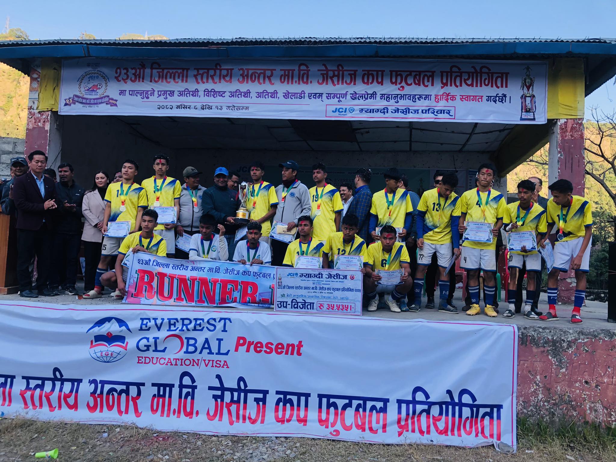 प्रतियोगितामा बिजेता विद्यालयलाई गण्डकी प्रदेशसभाका सदस्य हरि भण्डारी, बेनी नगरपालिकाका कार्यपालिका सदस्य कृष्णकुमार विश्वकर्मा, नेपाल जेसीजका राष्ट्रिय उपाध्यक्ष अनुप दुलाल, उपाध्यक्ष सन्दिर खत्री, बागलुङ जेसीजका शाखा अध्यक्ष सुशान्तकृष्ण श्रेष्ठ, म्याग्दी जेसीजका अध्यक्ष बिनोद घर्ती क्षेत्री,मुख्य प्रायोजक एभरेष्ट ग्लोबल एजुकेशन भिसा सर्भिसेस बेनीकी प्रमुख अस्मिता केसी बानियाँले रनिङ शिल्ड, ट्रफि, मेडल र प्रमाणपत्र सहित नगद ५५ हजार पाँच सय ५५ र उपबिजेताले ट्रफि, मेडल र प्रमाणपत्र सहित नगद ३५ हजार पाँच सय ३५ पुरस्कार वितरण गरेका थिए ।अन्तरमावि जेसीज कप फुटबल प्रतियोगिताका लागि एभरेष्ट ग्लोबल एजुकेशन भिसा सर्भिसेस बेनीले सन् २०२८ सम्म मुख्य प्रायोजन गरेको छ । म्याग्दीमा फुटबल खेलाडीको उत्पादनका लागि म्याग्दी जेसीज कपलाई गेट किपरको रुपमा लिइन्छ ।