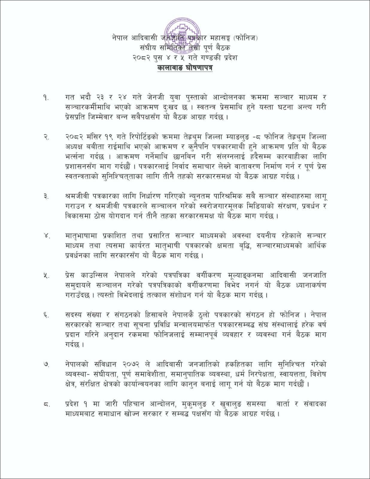 संघीय अध्यक्ष लक्की चौधरीको अध्यक्षता पुस ४ र ५ गते बसेको बैठकले घोषणापत्र जारी गर्दै नेपाल पत्रकार महासङ्घविरुद्ध देशव्यापी आन्दोलन गर्ने तयारी गरेको छ । बैठकले नेपाल पत्रकार महासङ्घको महाधिवेशनले दिएको म्यान्डेटअनुसार संस्थापक अध्यक्ष सत्यनारायणबहादुर श्रेष्ठसम्बन्धी विषयमा उच्चस्तरीय अध्ययन समिति गठन नगरेकोप्रति गम्भीर आपत्ति जनाएको छ । उक्त प्रक्रिया तत्काल अघि नबढाइए चरणबद्ध देशव्यापी आन्दोलनमा उत्रिने चेतावनी फोनिजले दिएको छ ।