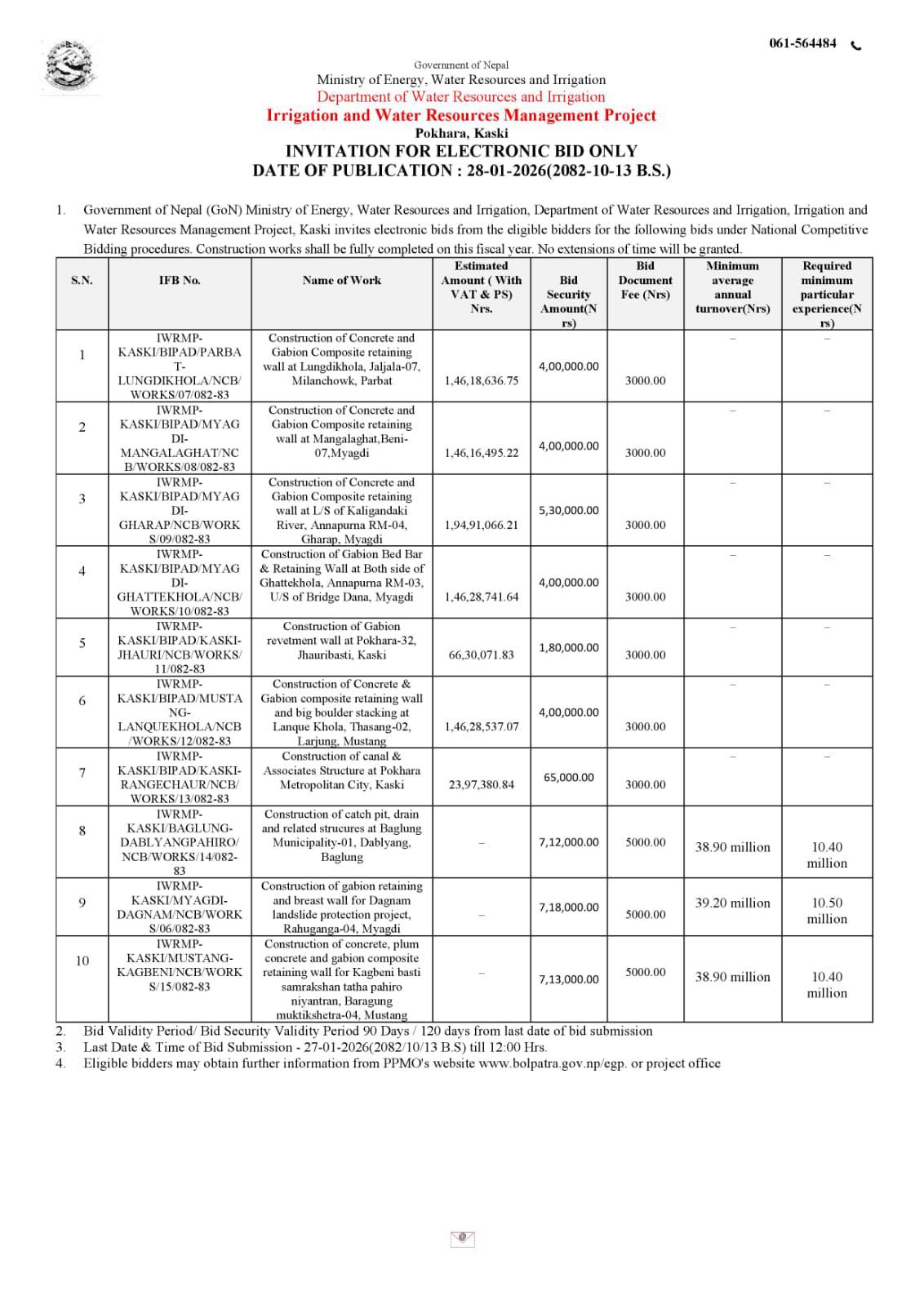 बेनी ।सिंचाइ तथा जलश्रोत व्यवस्थापन आयोजना कार्यालय पोखराले म्याग्दीमा एकैपटक चार वटा बस्ती संरक्षण आयोजनाका लागि ठेक्का आह्वान गरेको छ । निवर्तमान संघीय उर्जा ,जलस्रोत तथा सिंचाइ राज्यमन्त्री खमबहादुर गर्बुजा ‘खम्बिर’को पहलमा अन्नपुर्ण गाउँपालिकाको वडा नम्बर ४ घराप बस्ती संरक्षणका लागि एक करोड ९५ लाख ,सोही गाउँपालिकाको वडा नम्बर ३ दाना स्थित घट्टेखोला आयोजनाका लागि एक करोड ४६ लाख ,बेनी बजार संरक्षण आयोजनाका लािग एक करोड ४६ लाख र रघुगंगा गाउँपालिका–४,दग्नाम पहिरो रोकथाम आयोजनालाई करिब तीन करोड रुपैयाँको ठेक्का आह्वान भएको हो ।