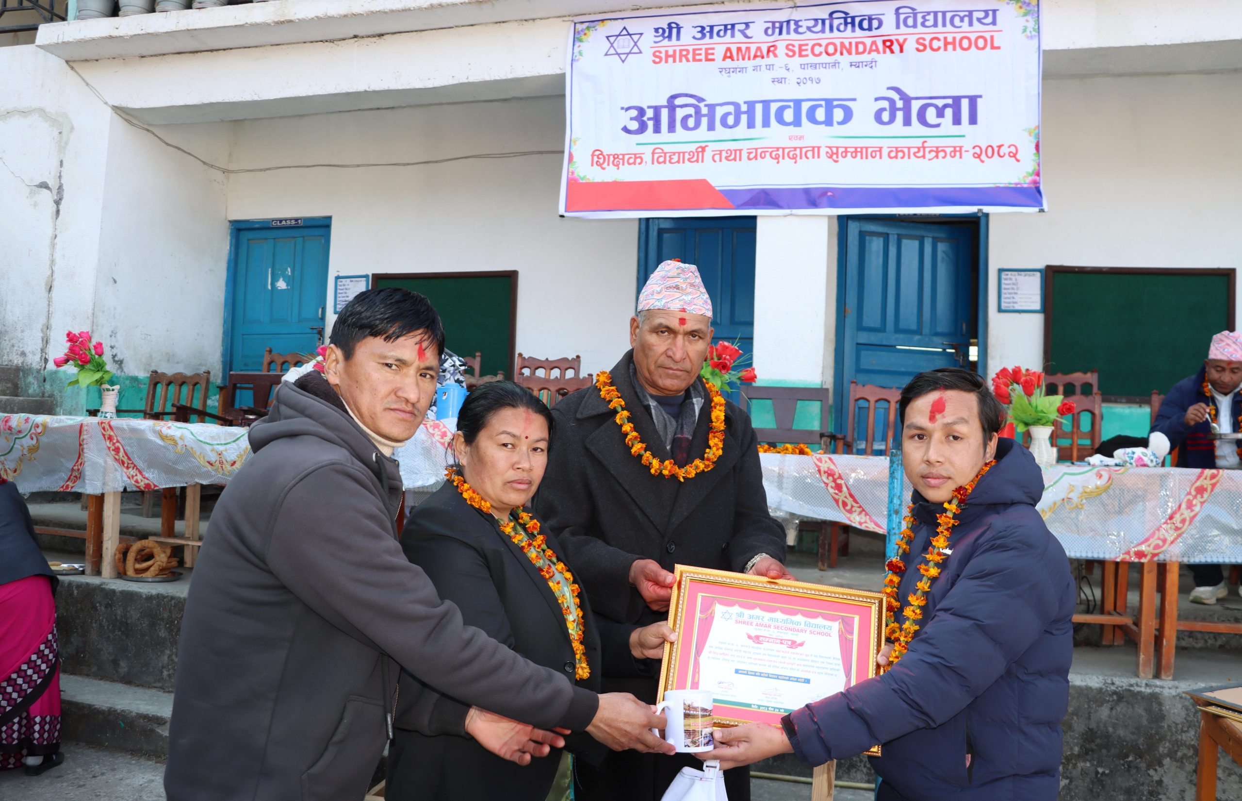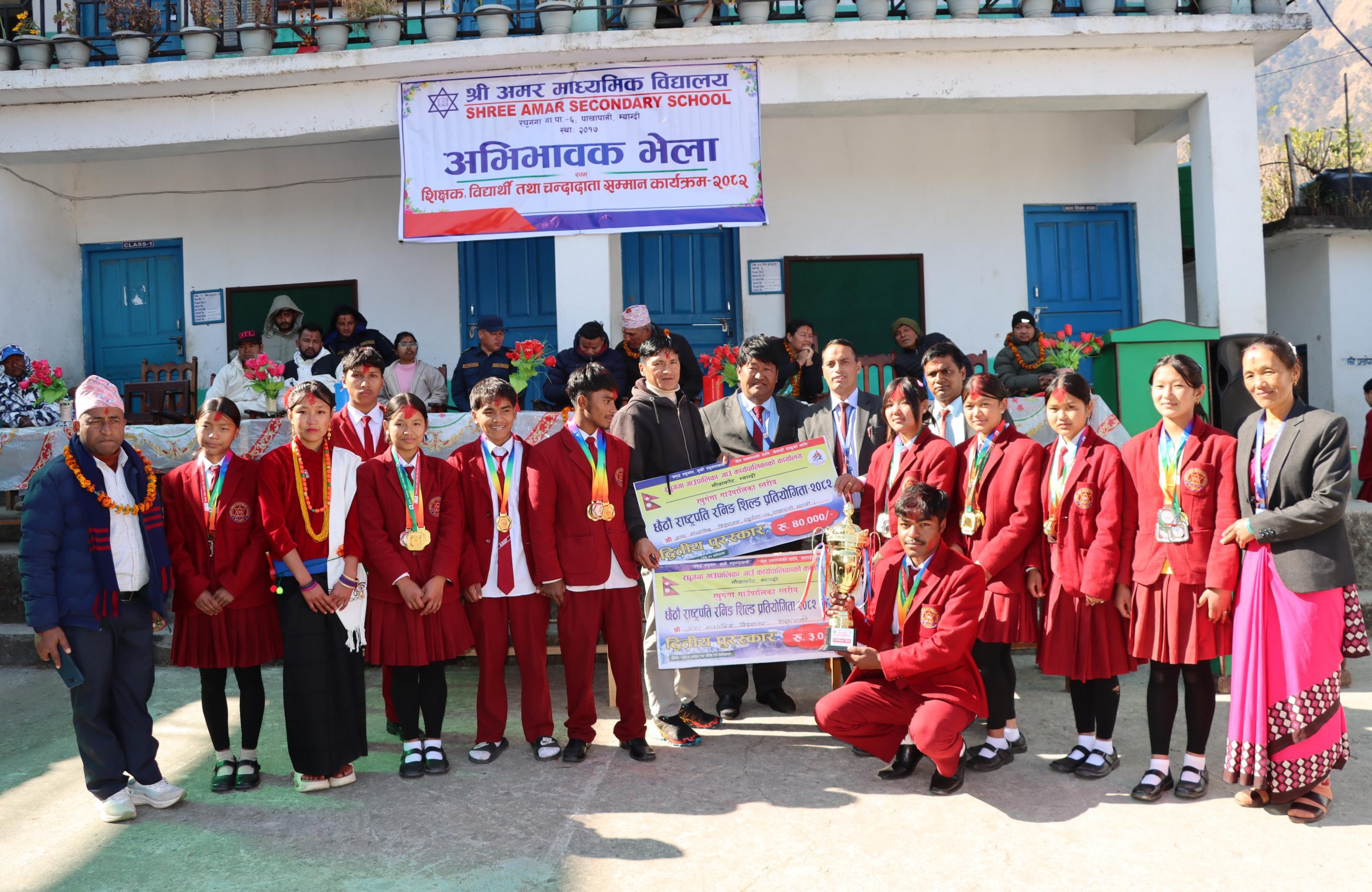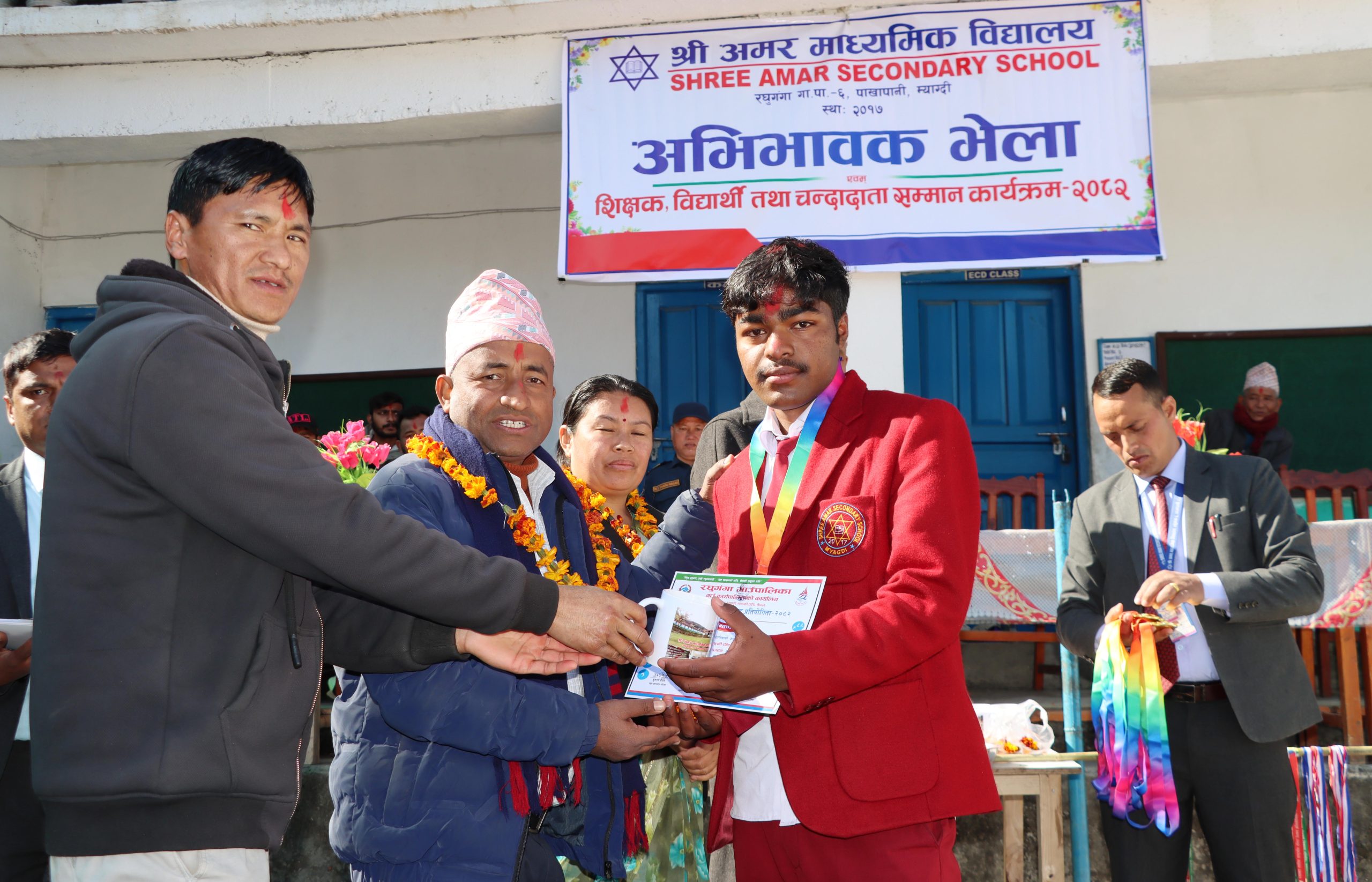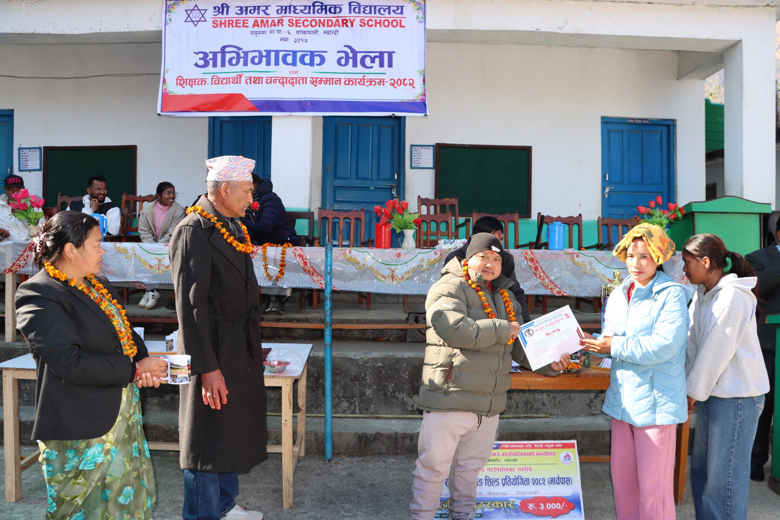 बेनी । म्याग्दीको रघुगंगा गाउँपालिका–६, पाखापानीस्थित अमर माध्यमिक विद्यालयमा अभिभावक भेला तथा शिक्षक, विद्यार्थी एवम् चन्दादाता सम्मान कार्यक्रम सम्पन्न भएको छ । आईतबार सम्पन्न कार्यक्रममा डम्मर–रेवती पुन स्मृति कोषबाट शैक्षिक सत्र २०८२ मा उत्कृष्ट नतिजा हासिल गर्ने तीन जना विद्यार्थीलाई क्रमशः रु १० हजार, रु ७ हजार र रु ५ हजार नगदसहित सम्मान पत्र प्रदान गर्दै पुरस्कार वितरण गरिएको हो ।