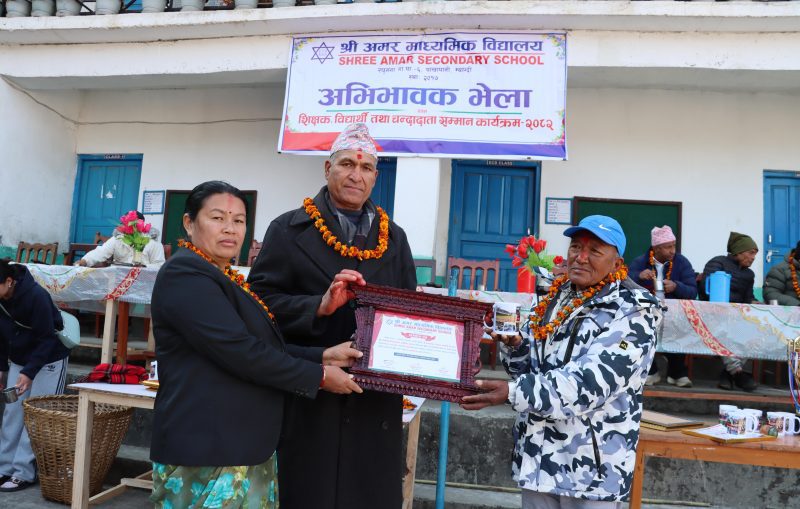 कार्यक्रममा विद्यालयको शैक्षिक विकास, भौतिक पूर्वाधार तथा विद्यार्थीहरूको उन्नत भविष्य निर्माणमा महत्वपूर्ण योगदान पुर्याएका चन्दादातालाई गाउँपालिका अध्यक्ष भण्डारी र उपाध्यक्ष प्रेमकुमारी पुनले मायाँको चिनो सहित कदरपत्र प्रदान गर्दै सम्मान गरेका थिए ।