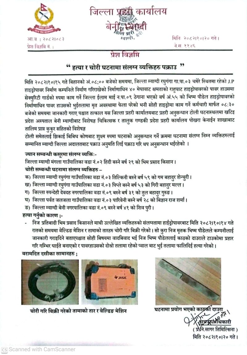 टाउकोमा गम्भिर चोट लागेको अवस्थामा शब फेला परेपछि घटना संकास्पद भएकोले अनुसंधान गर्दा सोही कम्पनीमा कार्यरत म्याग्दीको मंगला गाउँपालिका–२ हिदीका २९ बर्षिय भिमप्रसाद किसानको संलग्नता देखिएपछि पक्राउ गरिएको जिल्ला प्रहरी कार्यालय म्याग्दीले जनाएको छ । मंगलवार प्रेस विज्ञप्ती जारी गर्दै जिल्ला प्रहरी कार्यालय म्याग्दीले घटनामा पत्ता लागेका तथ्यहरु सार्वजनिक गरेको छ ।