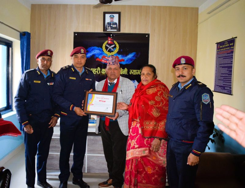 बेनी । म्याग्दीको रघुगङ्गा गाउँपालिका–२, राखु भगवतिमा प्रहरी चौकीको भवन निर्माण गर्न स्थानीयबासीले निशूल्क जग्गा उपलब्ध गराएका छन् ।भगवतिका राज गिरीले तीन रोपनी जग्गा मंगलबार राखु भगवति प्रहरी चौकीलाई उपलब्ध गराउनुभएको हो ।सरकारी दररेट अनुसार करिब १४ लाख रुपैयाँ मूल्य कायम भएको जग्गा स्थानीय बजारभाउमा बढी पर्ने जिल्ला प्रहरी कार्यालय म्याग्दीका प्रहरी नायव उपरीक्षक सुर्यबहादुर थापाले बताउनुभयो । जग्गादाता गिरी र उहाँकी श्रीमतिलाई जिल्ला प्रहरी कार्यालयले सम्मान पनि गरेको छ ।जग्गा प्राप्त भएपछि भवन निर्माणका लागि बजेट र योजना माग गरिने उहाँले बताउनुभयो ।