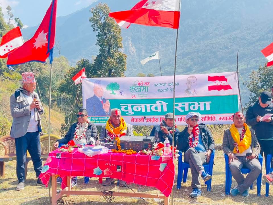 बेनी ।नेपाली कांग्रेस म्याग्दीको चुनावी सभा तथा मतदाता संगको भेटघाटलाई तिब्रता दिएको छ । सोमबार जिल्लाको धवलागिरी गाउँपालिका र मालिका गाउँपालिकाको विभिन्न वडामा चुनावी सभा सम्पन्न भएको छ । फागुन २१ गते हुने प्रतिनिधि सभा सदस्य निर्वाचनमा नेपाली कांग्रेसको तर्फबाट उम्मेदवार बन्नुभएका कर्णबहादुर भण्डारीले पश्चिमको विकास र रोजगारीलाई आफुले प्राथमिकतामा राखेर काम गर्ने प्रतिबद्धता व्यक्त गर्नुभएको छ ।