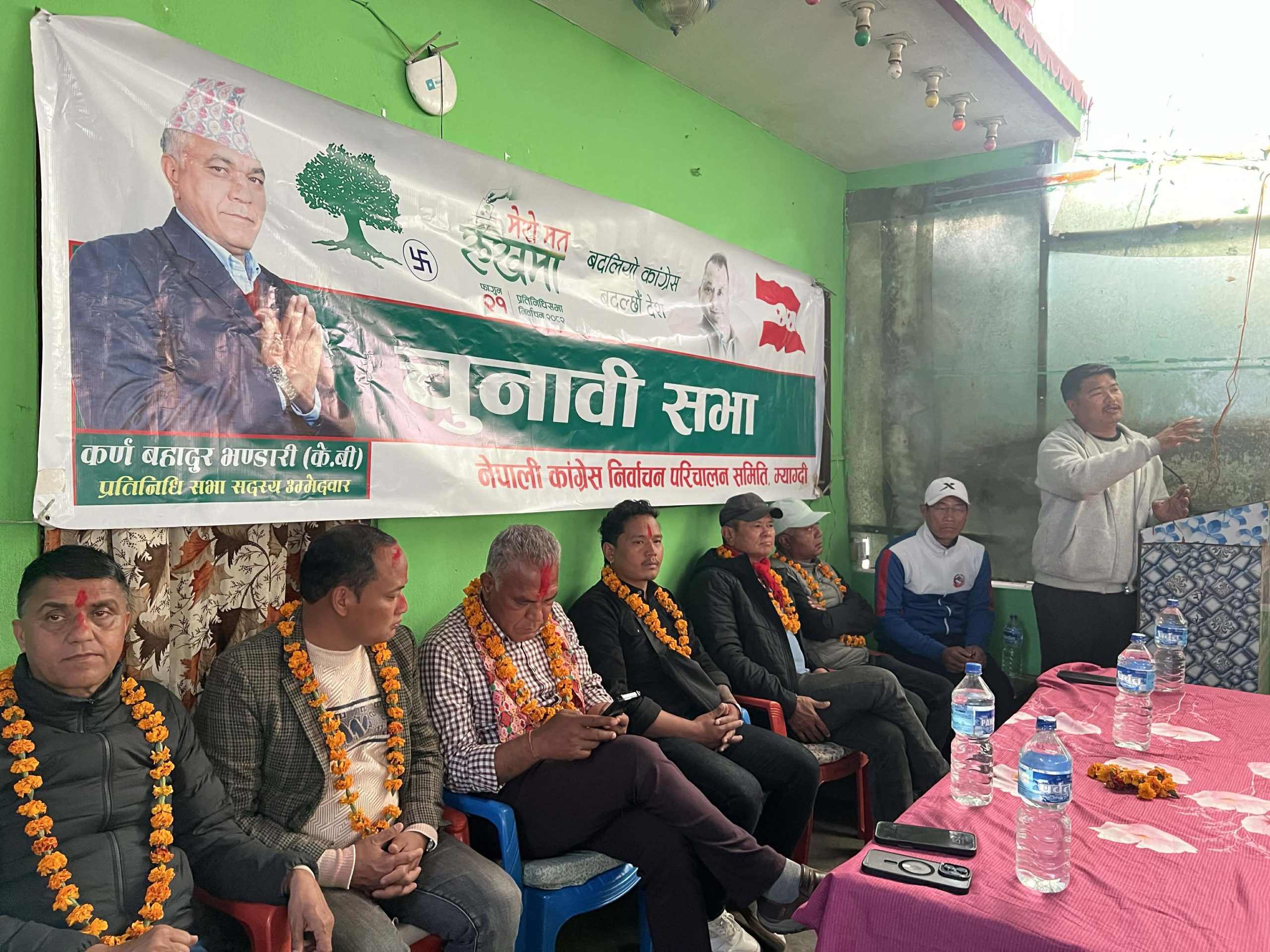 सोही अवसरमा निवर्तमान राज्यमन्त्री तथा नेपाली कांग्रेस म्याग्दीका सभापति खमबहादुर गर्बुजाले आफूले छोटो समयमा जिल्लाका लागि धेरै काम गरेको,बजेटदेखि लिएर योजनाहरुको निरन्तरता र जिल्लामा देखिएका समस्या समाधानको लागि प्रयास गर्दागर्दै देशमा उत्पन्न समस्याका कारण ती सबै प्रयासहरु अधुरा रहेका बताउनुभयो । उहाँले आफ्नो कार्यकालमा अधुरा रहेका कामहरु पुरा गर्नुका साथै जिल्लामा देखिने गरी विकास निर्माणका लागि बजेट र कानुन निर्माणमा कांग्रेसका उम्मेदवार कर्णबहादुर भण्डारी (के.बी) अझै योग्य भएकाले उहाँलाई भोट दिई विजयी बनाउन आग्रह गर्नुभयो । साथै मालिकाो दिच्याम र गगनपानीका बस्तीहरुमा घरदैलो समेत गरिएको थियो ।