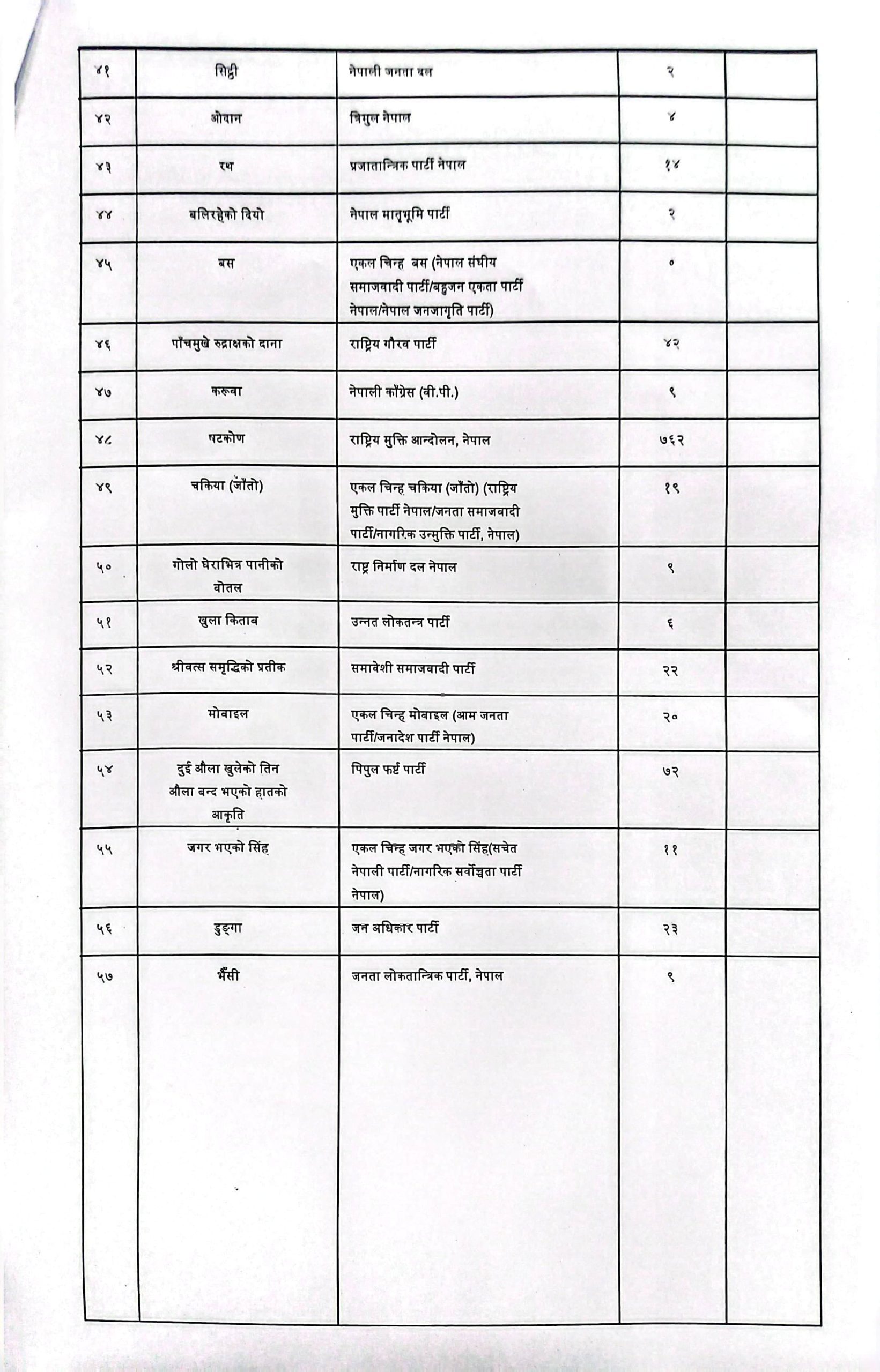 श्रम संस्कृति पार्टीले १ हजार ७१५, राष्ट्रिय प्रजातन्त्र पार्टी (राप्रपा)ले ८ सय ४४, राष्ट्रिय मुक्ति पार्टीले ७ सय ६२ र नेपाल कम्युनिष्ट पार्टी (माओवादी)ले १ सय ७७ मत पाएका छन् । जिल्लामा जम्मा मतदाता ८८ हजार दुई सय ९८ रहेकोमा समानुपातिक तर्फ ४७ हजार ६ सय १६ मत खसेको मध्य एक हजार ७१० मत बदर र ४५ हजार ९०६ मत मतगणना भएको जिल्ला निर्वाचन अधिकारी बिमलप्रसाद गौतमले बताउनुभयो । जिल्लाका सबै पालिकाहरुमा रास्वपाले अग्रता लिएको थियो । रास्वपाले स्वतन्त्र उम्मेद्वार पुनलाई समर्थन गरेको थियो ।
