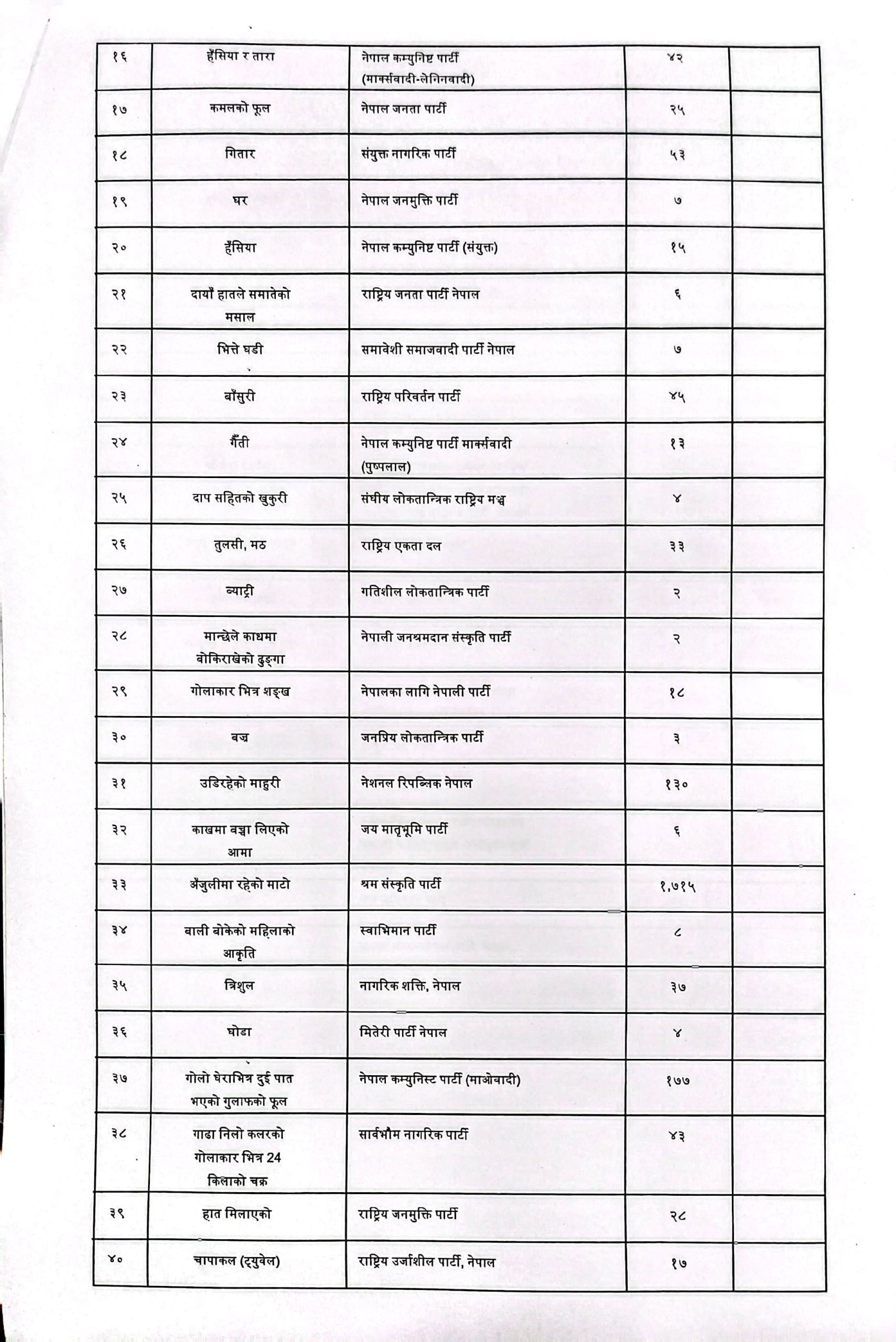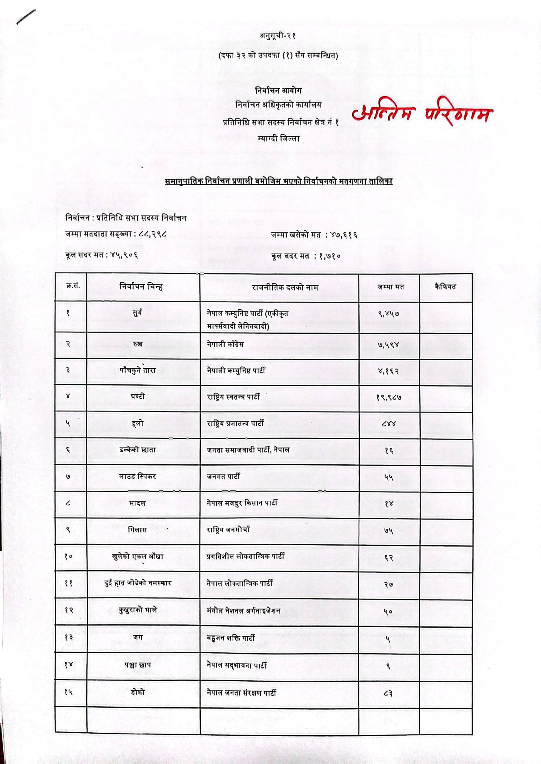 म्याग्दीमा महावीर पुनलाई समर्थन गरेको रास्वपा बन्यो समानुपातिकमा पहिलो दल,कुन दलले कति मत ल्याए ?(सुची सहित)