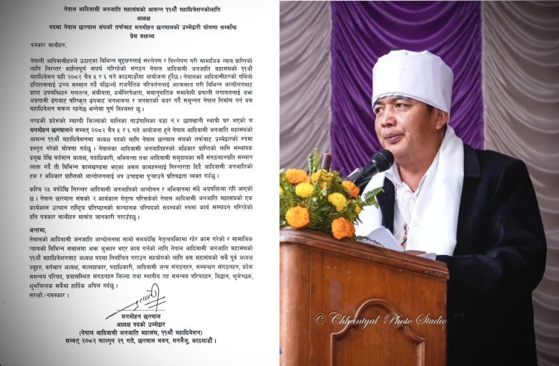 बेनी । नेपाल आदिवासी जनजाति महासंघको अध्यक्षमा म्याग्दीका मनमोहन छन्त्यालले उम्मेद्वारी घोषणा गर्नुभएको छ । नेपाल आदिवासी जनजाति महासंघको ११औँ राष्ट्रिय महाधिवेशन यही चैत ५ र ६ गते काठमाडौंमा हुँदैछ ।शुक्रबार महासंघको अध्यक्ष पदमा उम्मेद्वारी घोषणा गर्नुभएका छन्त्याल संघका पूर्व अध्यक्ष समेत हुनुहुन्छ । लामो समयदेखि नेपालका आदिवासी जनजातिहरूका सामूहिक अधिकार, पहिचान र प्रतिनिधित्वका सवालमा निरन्तर सक्रिय छन्त्याल म्याग्दीको मालिका गाउँपालिका–४,छाप गाउँमा जन्मनुभएको हो ।