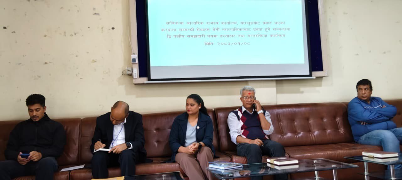 बेनी । आन्तरिक राजस्व कार्यालय बागलुङबाट संचालन हुँदै आएको करदाता सेवा पहिलो पटक म्याग्दीको बेनी नगरपालिकाबाट सुरु भएको छ । नगरपालिकाका प्रमुख प्रशासकीय अधिकृत अर्जुन शर्मा र आन्तरिक राजस्व कार्यालय बागलुङका प्रमुख कर अधिकृत कपिल सिलवालबीच मंगलबार समझदारी पत्रमा हस्ताक्षर भएपछि सेवा प्रवाह औपचारिक रूपमा सुरु गरिएको हो।